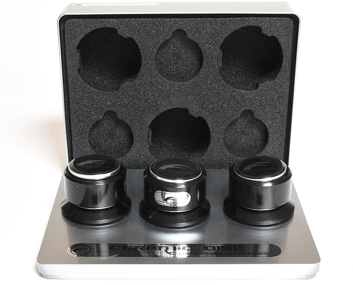 Many footers on the market are based on what was probably the first after-market footer ever, the humble aluminium cone or spike. One of the theories behind its workings was that it acts like a mechanical diode through which vibrations pass only one way but not the other (i.e. out, not back in). In our opinion any cone-shaped footer acts as a tuning device first and as a vibration control item only in a secondary add-on fashion. The same applies to footers where a single ball forms the sole contact area with the supported equipment. The small contact patch of the ball is under very high pressure and thus creates an area of high tension in the equipment’s casing which definitely alters its mechanical behavior.