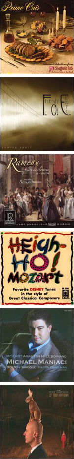 "La Clemencia di Tito: Aria" from Mozart: Arias for Male Soprano/Pearlman/Boston Baroque Michael Maniaci [Telarc TEL-31827-02] is a stunning recording capturing the immense acoustic of the hall and the astonishing vocal gymnastics of male soprano Michael Maniaci supported by Pearlman conducting the Boston Baroque. It’s a rare chance to hear a forgotten vocal musical instrument once referred to as the castrato from a time when the church dictated that women’s voices remain silent in song and the male soprano held musical court. Superb performance and engineering work.