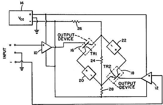 "A pair of independent floating power supplies are cross-connected between the two output devices so that the supply terminal of each output device is connected to one terminal of one of the power supplies, while the output terminal of each of the output devices is connected to the opposite phase terminal of the opposite power supply. A resistor is connected between the output terminal of each of the output devices and one terminal of the power supply which powers the driver stages. The load is connected between output terminals of the output devices. The circuit arrangement provides control of the value of the quiescent control input current of each of the output devices which in turn controls the quiescent value of the bias currents of each of the output devices, thus resulting in an amplifier of greatly improved thermal stability...." |