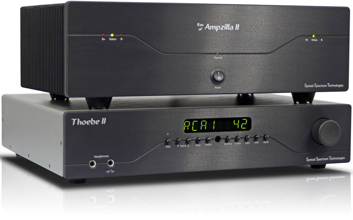 Blue was cool during the days of Miles Davis, that Ampzilla logo hip during the heydays of the Starship Enterprise TV run. Alas, all that was before Apple's almighty winter with its global white-out and general crisp sleek-up. For SST's new Son of Ampzilla II stereo amp and matching Thoebe II full-function preamp, EJ takes his cue card from Henry Ford and Men in Black. It's a black tie affair exclusively, with threads more conservative. |