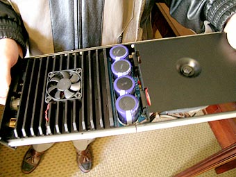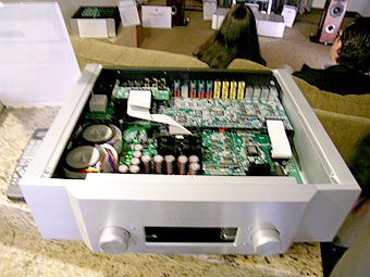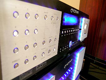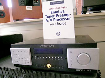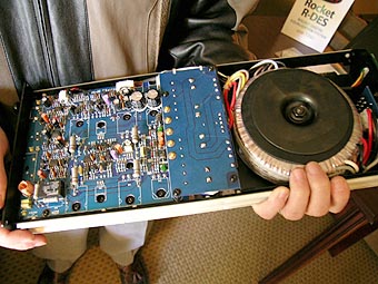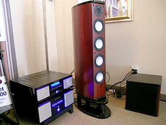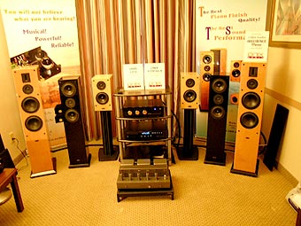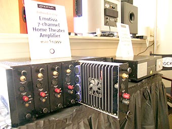 | Yanking the power cords from the wall outlets for a demonstration, the system continued playing unruffled, clearly supplied by DC battery power. The incoming power utility AC is filtered, surge protected, then rectified to DC and regenerated to AC by an inverter circuit. A battery module on the DC side ensures full rated current and voltage regardless of wall voltage. This double conversion's intermediate DC circuit is said to shield effectively from EMI, RFI, spikes, high voltage transients and surges. A steady 120V/60Hz sine wave is maintained regardless of voltage spikes or sags on the line. Multiple models accommodate different systems power requirements. "Fascinating", quipped Spock, he of the pointy ears. "Make it so", countered Srajan, he of the pointy nose. Meanwhile, the tireless crew around Mark Schifter and Walter Liederman of AV123.com seemed hellbent on rewriting the rules of conduct unbecoming, that is to say, aim a few loaded Howitzers at the overpriced market. In case you weren't aware, these gents now operate their own factory in Mainland China to guarantee aggressive value pricing, with Mark Schifter spending 6 months out of the year in China to personally oversee operations and insure Western-style QC and fit'n'finish. After what I saw in their room, I propose one of those movie poster slogans to greet the competition: "Be afraid. Be very much afraid!" From the Rocket Loudspeaker brand whose flagship RS 1000 6-driver 4.5 way tops out at $2,799/pr but starts at $249/pr with the entry-level model; to the Onix Electronics comprised of the A-60 MkII remote-controlled integrated [$695], the A-120MkII [$995] dual-mono high-power integrated and the $1,495 CD-1; to the Onix Reference Loudspeakers of the Reference One [$1,500/pr], Reference Two [$2,500/pr], Reference Three [$4,500/pr] and Reference Center [$875]; to the new brand Emotiva which includes the DMC-1 Digital Media Center Tuner/Preamp/ Processor with Twin Motorola Symphony DSPs [$3,495] and MPS-1 [$1,995] 7x200watt, 120lbs. amplifier... phew, where was I? You get the idea. This room was an Aladdin's cave of price-conscious goodies. Let the pictures speak/spec for themselves. |