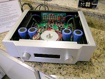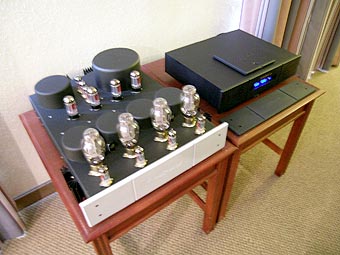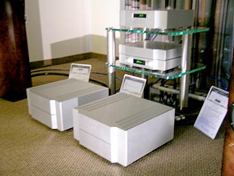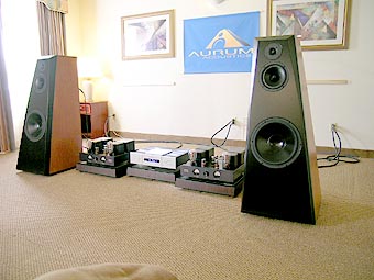 Already anticipating consumer demand, Aurum also showed a prototype stereo version of their direct-drive monos which houses four channels of amplification and the requisite crossover networks in one very deep chassis. The monos on display sported 300B triodes for the mid/hi drivers while the speakers proper were sealed designs with an anechoically rated response of -6dB @ 20Hz, all cabling Cardas with convenient Neutrik 4-pin XLR terminations. The Integris CDP [available in black or silver] uses Anagram's ATF 24/192mkII technology, a top-loading custom-suspended Philips Pro transport and offers very comprehensive connectivity. An integral DSP-executed multiband parametric EQ allows room correction while a phase correction protocol specifically for the Integris Active Loudspeaker System eliminates excess phase. Future upgradeability includes upgrades to full DSP-controlled active crossovers. | |||||||||||||||||