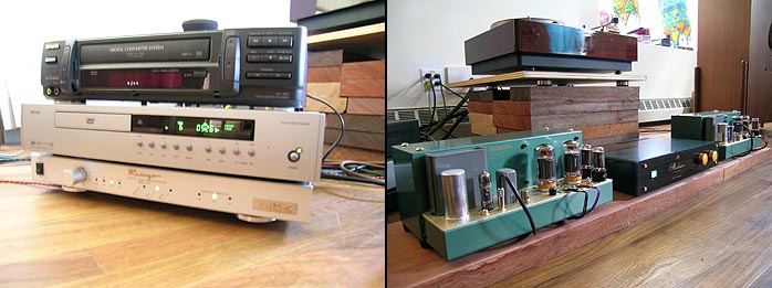 The Shindo-fied Garrard 301 with Ken-San's own arm and cartridge was out of commission because the new arrival in the owner's family had just a day prior taken to scaling the table to sit on the platter rotating in a free merry go-round. Jonathan was heart-broken to find that one channel hadn't survived the toddler's Carneval but he needn't have worried - the Arcam/Reimyo transport/DAC digital front-end was more than up to delivering the goods. |