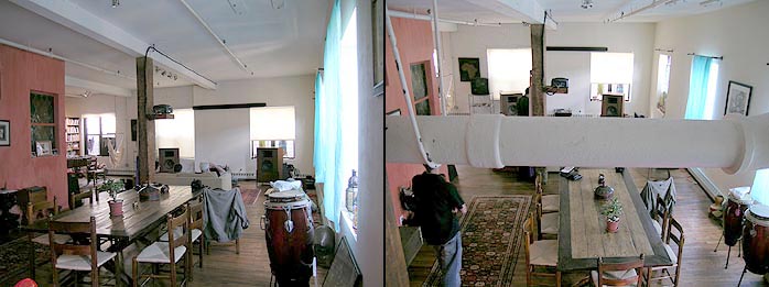 The room pix are included to convey a notion of the sheer size of this cavernous space which the 15" woofers and compression tweeters had no issue filling effortlessly. My favorite listening position was at the end of the table far behind the couch! At less than a quarter the retail of the previous system, this one boogied and had the kind of drive everyone present seemed to take an instant shine to. |