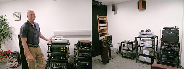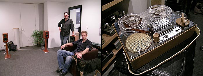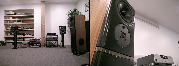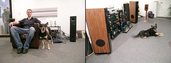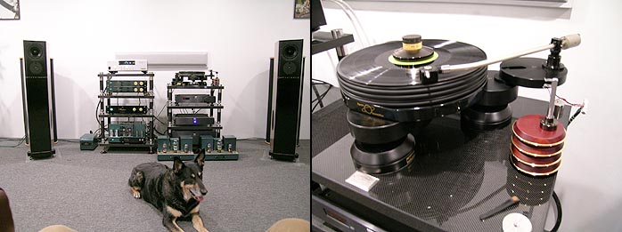 Home to the country's first pair of DeVore Fidelity Silverbacks who have since started shipping, with designer John DeVore on hand [above] to explain its inner workings, I learned that the composite enclosure contains six individual chambers, with a 1/3-depth box for the custom tweeter, a triangular midrange trap and four tuned subenclosures for the opposed side-firing woofers. Since its debut at the CES, many subsequent refinements have delayed production until now but the big ape's showing here on the floor suggested that the $14,000/pr wait was well worth being patient and as of today, Jules has taken delivery of a review pair to spread the good news. |