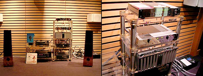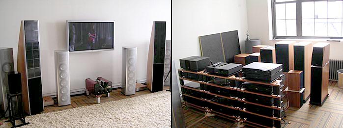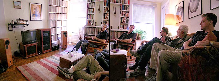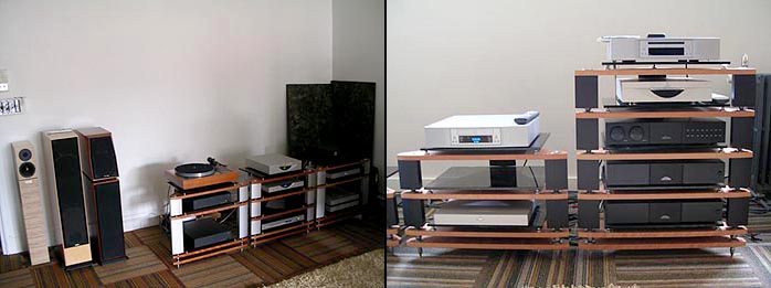 Too overstimulated to pay too much attention to matters of sounds at this point, we simply socialized to shoot the breeze, digest the truly humongous prior Pastrami sandwiches at Katz's, admire John's stunning new Cherry finish on his Gibbon 8s and note his custom multi-tier suspension mod of a VPI turntable. |