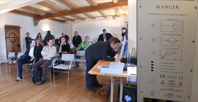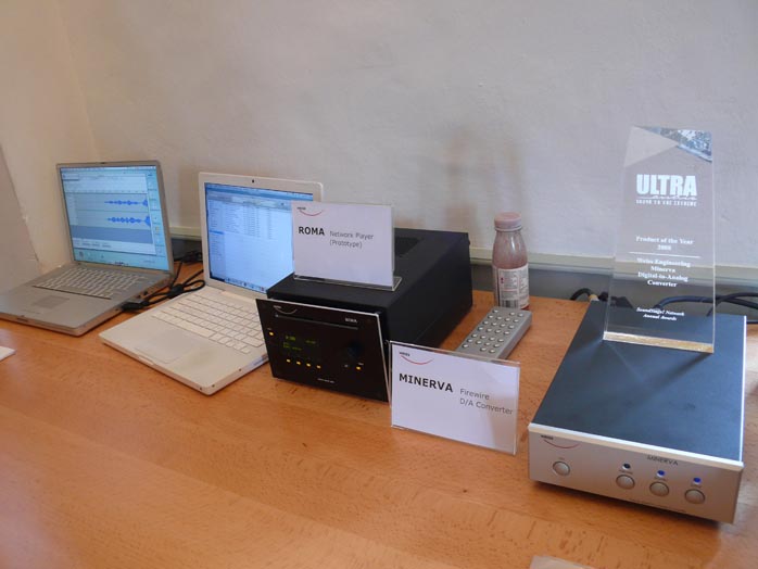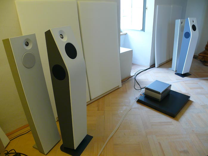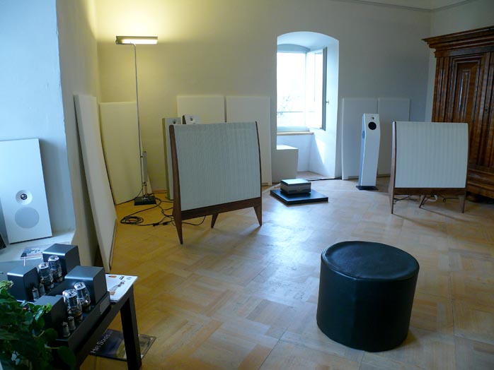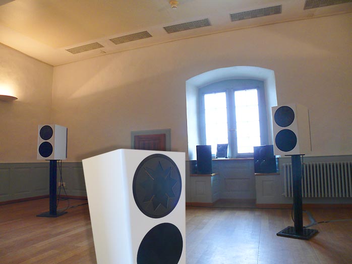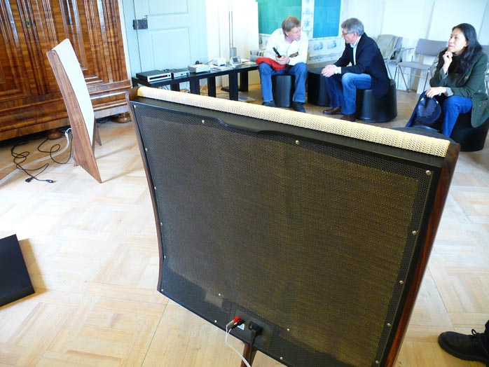 The smaller -- and very attractive -- Klangwerks were on static display in the highlight exhibit of the show, the Quad Musikwiedergabe room. The active €9.400/pr Ella with its curved Corian baffle and two sidefiring 145mm woofers includes 30 and 40-watt amplification and features in one of our syndicated fairaudio.de reviews. |