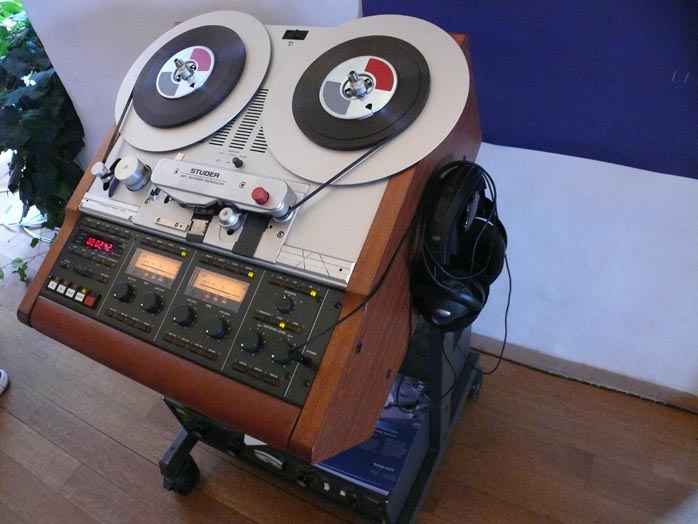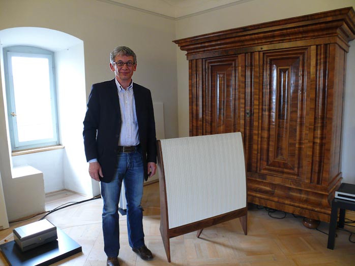 The ESL 57QA (Quad Atelier) next to him isn't a classic refurb. It's a from-the-ground-up current production speaker with taller feet and a somewhat higher baffle to include all the transformer and network bits 'n' bobs along the lower edge. As Germany's official Quad importer, Herr Stein eventually had opportunity to acquire Walker's original diaphragm stretching machine. And that's how these new classic Quads are made - incidentally in a grill cover color of your choice, standard or high footers and various wood trim. The reborn 57 retails for €7.790/pr, the matching 63 for €9.490. |