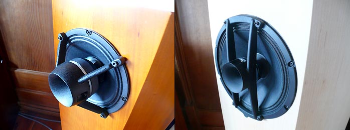 That's because Swissonor specializes in such gear. For one, they offer replacement parts for the vaunted Thorens TD124 in MkI and II versions - a non-magnetic base platter and aluminum top platter as well as a tone arm mount from BHI Panzerholz (literally, tanker wood) dedicated to long tone arms. But they also make speakers and the B.A.C.H. 12 aka bass-adjustable coaxial horn is a dual-concentric 12-inch two-way with concentrically mounted horn-loaded tweeter in an enclosure whose foot print suggests ideal corner placement. |