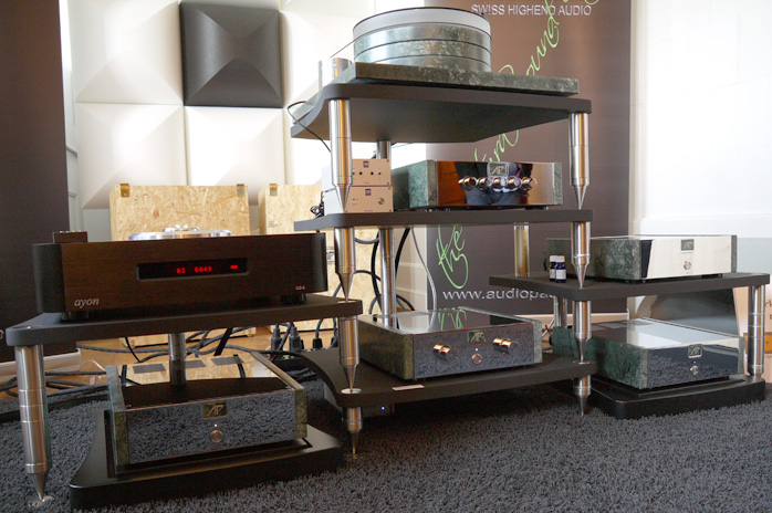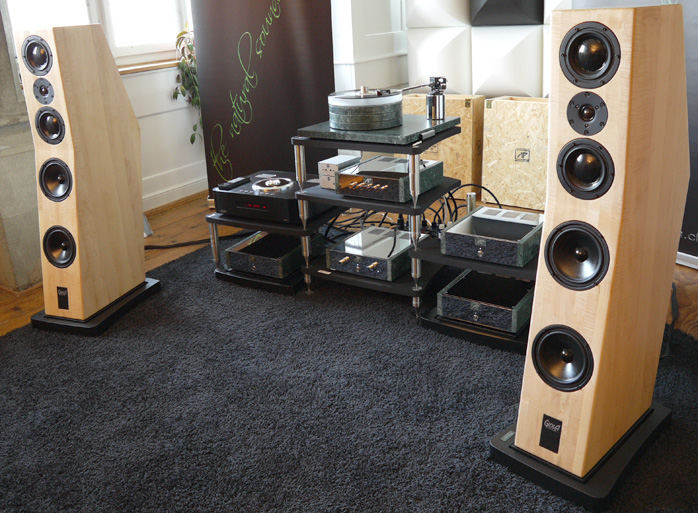 Audiopassion is a Swiss brand with a Bern showroom I'd not encountered before. Their electronics combine valves in the preamp with class D modules in the power amps. Their 5-driver 3-way Gioia loudspeakers are built up of solid tone wood while the Audiopassion turntable is available in Verde Guatemala marble or Bergahorn wood and fitted with Kleintechnik motors.