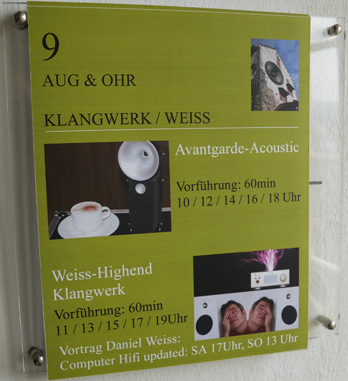 Being a proud new owner of a Weiss DAC2 leashed up to a 1TB iMac via Firewire 800 already loaded with 4000 songs in WAV and AIFF, I was keen to touch base with Daniel Weiss. The man was sadly at a funeral but still expected to make the planned 5:00 seminar on computer audio - by which time we'd long since departed.