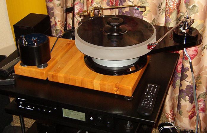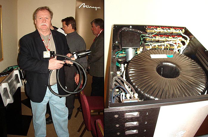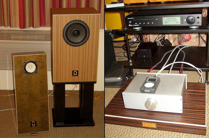 Jeff Beck sounded great blasting from these puppies - a guitar lover's speaker if there ever was one. The Superhemps are all about tone and they have got it in spades based on what I heard. I know my colleague Gary Beard at Positive Feedback was impressed big time with the hemps. Check out his review. Vinnie had his new Signature 30 prototype amp on hand. It features an OEM Tripath board based on the TK2051 chip set and DACT CT2 stepped attenuator volume control. As per usual, Vinnie has fully tricked out the innards with premium parts. Playing time between charges will be over 12 hours. Most of the digital playback I heard in this room was provided by a Red Wine Audio modified iPod in lossless mode. Along with his own line of affordable cabling, Hudson Audio's Tom Hills imports fj Loudspeakers (rather unfortunate initials don't you think? Sort of like MF or DB), Lehmann phono stages, Eurolab turntables and Moerch tonearms [fj stands "for Johanna", similar to the ModWright preamp initials - Ed]. |
