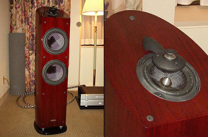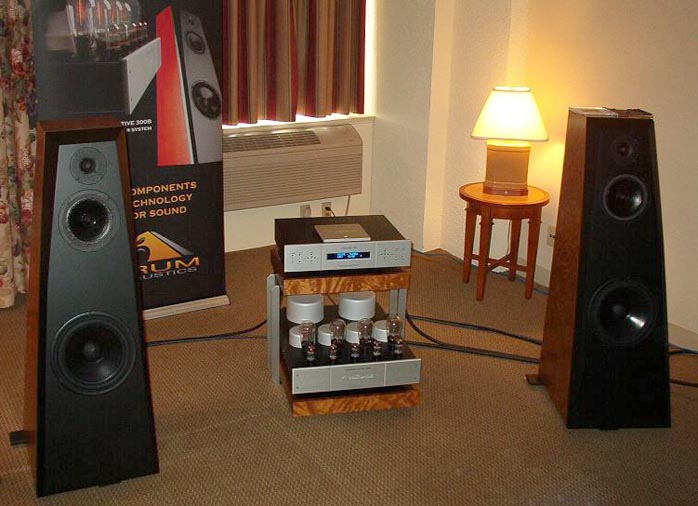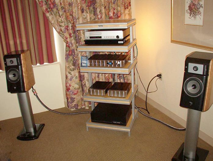 One of the more impressive systems I heard two years ago in Montreal was back again this year. Aurum Acoustics's Derrick Moss all the way from Conception Bay/Newfoundland (love that name) showed off a slightly refined version of his synergistic Integris system. The crossover-less speakers are driven by a hybrid 6-channel amp with Bryston solid-state power for the woofers and 300B magic handling the mid and high frequency drivers. All crossover circuitry is placed prior to the amp section. Custom Cardas cabling, system rack and Integris CDP single chassis preamp/CD player complete the picture. While expensive to guys like me, this circa $50,000 package was utterly transparent, dynamic and completely effortless. Even on an overly compressed CD such as Matt Mays' self-titled album, the magic shone through. I was especially impressed with the smaller, more room-friendly speakers compared to the larger ones from two years ago. I wasn't the only one impressed as Soundstage's Doug Schneider and UHF Magazine have already claimed dibs for review samples. Even if fifty large is out of your price range, you owe it to yourself to hear this system if you can. Considering the horrible dimensions of the room, Derrick managed to avoid most room-related nasties by setting up the speakers at a 15-25 degree angle and placing chairs for nearfield listening. While $50,000 systems are a little out of my comfort zone, I urge my fellow moonies to request a set for review. "Paging Mr. Potis, killer system in aisle twelve"... |