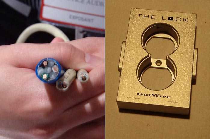 GutWire displayed their wide range of cables including three new bulk cables. The larger blue covered cable, the B-12 (CDN$30/ft), is aimed at the DIY AC cable market and features oxygen-free copper conductors, a braided shield and PE spacers to minimize crosstalk. The other two are speaker cables rated for in-wall use. Also on display was an updated version of the MaxCon power conditioner, the larger MaxCon Extreme and a cool little accessory for those big heavy power cables that inevitably hang at an uncomfortable angle from the average wall outlet. The appropriately named "The Lock" fits over your outlet box and firmly holds your big nasty heavy duty power cables sans droop. Cool. Speaking of big nasty power cables, I shall be reporting on GutWire's statement X Clef SQ power cable (CDN$3,399) as well as the B-12 DIY cable. Of all the power cables I have sampled over the last few years, the GutWires have remained favorites. With few exceptions, they impress big time in terms of noise rejection/reduction, clarity, weight, dynamics and sheer listening ease. Perhaps not to all tastes and systems but for me in my system, they work wonderfully. |