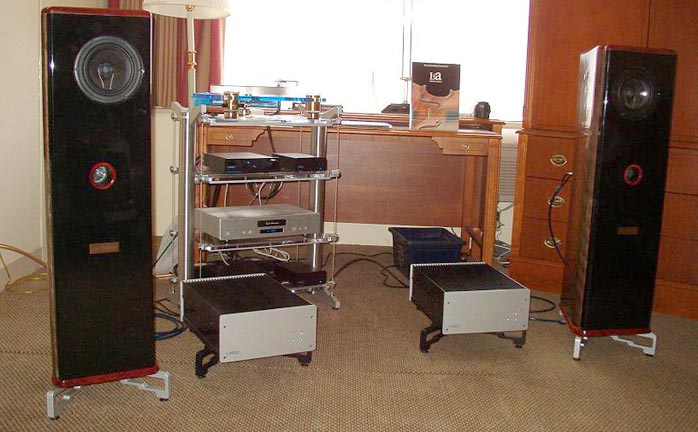 | It's always a fun time hanging with Omega's Louis Chochos, Vinnie Rossi from Red Wine Audio and Tom Hills of Hudson Audio. Along for the ride this year was Noel Nolan, owner and head bottle washer of Skylan Stands. As at RMAF 05, these colorful characters demoed a completely battery-powered system including the Eurolabs turntable. No funky AC problems to contend with here. Louis introduced his new floorstanding Super 3 XRS which is basically a bigger version of the Super 3 stand mounter [presently for review with Jeff Day - Ed]. At a mere US$850/pr, these are one heck of a bargain and sounded like loads of fun. Also seeing lots of action was Omega's Superhemp sitting on Skylan stands of course. |