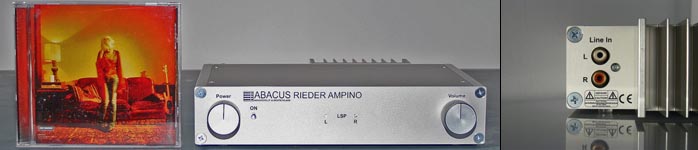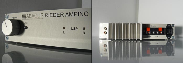 Performance Though speaker cable quality was said to have no sonic impact, I wasn't prepared to abandon my wiring for zip cord. I thus had to jerry-rig suitable adaptors to run my customary banana-fitted Inakustik Black & White into the spring clip sockets. At least my CD player connected as usual via the RCA inputs. Then it was power-up to insure proper connections. Lucinda Williams' World Without Tears still sat in the spinner (a well-above-average recording by the way) and a few bars later, I'd duly forgotten various errands I'd committed to for the afternoon. An hour and CD passed in a flash. The weighty Country sounds, melancholy lyrics, insistent voice ... I got so completely absorbed in the music as to sorely need something happier next: E.S.T Live in Hamburg. Now usually, I'm no great fan of live recordings. I'd tried more than once before to sit through both CDs here beginning to end, albeit with no success. Yet this time the mere notion of interrupting things didn't even arise. Having to change CDs in midstream was a bother. The music was so compelling. It's rare to find such intensity on a disc. You imagine feeling the same tension that occurred during the session itself; being present during the creation of something phenomenal, between the musicians, between them and the audience. Wow. Urgently recommended if you like Jazz. Now you expect an en détail rundown of the Ampino's sonics. To be honest, I'm not in the mood because this little amp gets something just so darn bloody right; doing what really good hifi kit does: It puts the music center stage to make it relevant. But if you insist, I start counting the peas. The bass goes low with control but could be blacker and bouncier yet. Could but doesn't have to be. Certain amps create more speed, more explosiveness within dynamic structures. I've even heard amps that were tauter and more controlled. But who needs that? Yet others resolve persnickety detail a few molecules deeper. As though I cared. Basically, I just wanna hear more music. Overall, the Ampino is ultra neutral to handle whatever musical styles you throw at it. The focus always remains on the music. This includes being able to erect realistic ambience that's dominated by the recording, not the amp. The Ampino allowed me to listen through the most varied of recordings and mostly louder than usual which didn't imply the Ampino couldn't do quiet. But when listening is this much fun, levels automatically escalate. With the Ampino, nothing caved in. Be it Rock or classical, I always felt welcome to get involved. Yet nothing about the amp was artificially seductive. Even long-term, nothing became overbearing. The only thing that sucked were bad recordings yet even there the Ampino wasn't about spotlighting every last oversight. Rather, it made the best of what it was fed. A few hours into happy listening, remember to stay away from the heat sink. Its temps far exceed the comfort zone. What this predicts about the longevity of the output transistors is anyone's guess. To be honest, I'm not quite sure how the Ampino delivers its power in the first place, considering the small mains tranny inside. Many a CD player comes more endowed in that department. Combine this sound with a more tricked-out enclosure and perhaps snazzier marketing campaign and this puny amp would be destined for major laurels. As is, you'll have to muster the gumption to part with 530 euros for the Abacus Rieder Ampino without incurring an image issue. Should someone find fault with your choice, simply fire it up. A few bars into it, all supremacy smirks will evaporate and the amp cease to be important, to be replaced by musical comments. Now colleague Werner wants to listen to this amp. I reckon he can wait a bit longer. |
