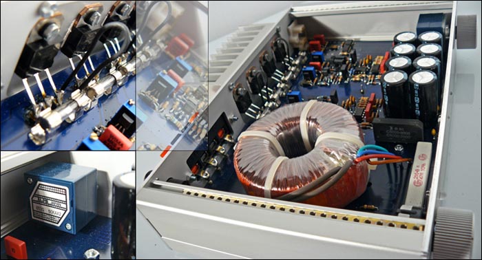 Trim The Ampino's front, dedicated as power amp with a single input, merely carries a power mains and volume control, making a source selector redundant. Those knobs look old-fashioned but not enough to qualify as vintage. Adjacent to the power button glows a stylish blue LED to signal work mode. In the middle, two further LEDs signify aberrant behavior. So far, so simple. It's on the business end that things get jammed. An IEC power inlet sits next to four speaker terminals of the most basic kind. Most the space is taken up by the aluminum heat sink which, considering the claimed 50-watt power rating, isn't exactly large. But the more sharp-cornered for it. Clearly this part was originally commissioned for internal use. Next to it is just enough room for a pair of RCA inputs. Here one can connect the matching Prepino preamp to feed various sources. One-source customers with just a CD player for example can go Ampino direct due to the provided passive potentiometer. Innards A glance under the bonnet surprises. How few parts are needed to make a power amp. All ingredients are cleanly sorted on a circuit board with toroid. No matter how kit the chassis may look, what's inside leaves no doubt as to its professional roots. The board layout is tidy, construction is solid, there's a blue Alps for volume. Here the Ampino looks like a bona fide hifi machine. Were it not for the fuses directly ahead of the output transistors. Aw shucks, with the Ampino you get used to following a different drummer who gives the finger to normal mainstream criteria. Aside from "valve circuit" output transistors (the latter fused) and simplistic loudspeaker sockets, another part of the Rieder amp concept is direct feedback - which might have High-Enders flinching seeing the bad rep NFB suffers in certain quarters. Yet here feedback is viewed as a kind of universal panacea which includes the speaker cables, crossover and voice coil inductance in its loop to eliminate their deleterious effects. So I finally made peace with this amplifier's insistence on following its own lights. Amen. |