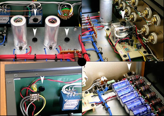 The instruction sheet suggests all kinds of potential applications for the little resonators: on the top, bottom, front or rear panels of equipment, positioned either in the center or in each of the four corners; positioned on the surfaces of loudspeaker cabinets; on driver mounts of loudspeakers; on listening room walls, ceilings or floors; on CD transports; on power switches; and inside electronics on vibration points like transformers, capacitors or even DAC chips. The take-home message is that only your imagination is the limit as to where to apply QR-8 resonators. Tricking Out the Leben RS28CX Vacuum Tube Preamplifier with the Full Acoustic Revive Treatment My reference Leben RS28CX full function vacuum tube preamplifier certainly doesn't need any help to sound fantastic. It pretty much blew me away straight out of the box with its excellent sonics and beguiling musicality. I figured the über-performing Leben preamplifier would be a good test of the latest Acoustic Revive goodies under review because if they could improve on its formidable level of performance, then they'd certainly have my vote. The Leben RS28CX preamplifier has a dedicated ground connection on its back panel that makes hooking up the Acoustic Revive RCC-24 ground conditioner as easy as can be. Ken says that after attaching the RCC-24, to locate its main body underneath the preamplifier's transformers for an additional benefit. That doesn't work with the Leben RS28CS though as its power supply -- and thus transformers -- are housed in a separate chassis (but you should give it a try on your preamp if it's laid out with trannies in the main chassis). So with the Leben RS28CX preamplifier I just left the RCC-24 sitting next to it which worked just fine. Installing the Acoustic Revive SIP-8F RCA shorting plugs into the Leben's RCA inputs couldn't be easier: All you do is plug in the SIP-8F shorting plugs into any empty RCA inputs and you're good to go. I treated the inside of the Leben RS28CX preamplifier according to Ken's suggestions with the QR-8 quartz resonators: I placed one on the chassis back panel directly over the power receptacle for the Leben's power supply (the black dot between the two bolts in the upper photo montage; one next to the front panel power switch and warm up indicator light; one between each tube on the mounting plate in the triplet of tubes at the front of the Leben's chassis; one on the back of the volume pot; one on what appears to be a small isolation transformer for the Leben's phono stage; and one in the center of the top cover of the preamp - whew! Oh yeah, I also put one on the back of each shorting plug. |