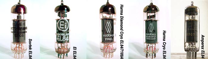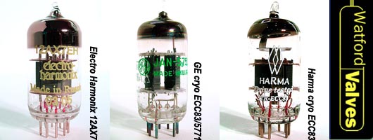 Next up was the Harma E84L/7189A Cryo job. The Amperex and Russian military bottles don't at all sound alike. My initial impression after the Amperex on Blue Country Heart was that the Harma E84L/7189A Cryo valves were a little less detailed and dynamically nuanced, a little less dramatic but more evenly balanced in the bass yet with less distinct pitch definition. The notes didn't seem to decay as long and there was a lesser sense of space. Lucinda's Tears confirmed the lesser bass impact, sounding a little withdrawn compared to the Amperex. However, there also was something beguiling about their sound and the way they played music made me want to listen more and more. With the Harma E84L/7189A Cryo valves, the recording took on a more natural and relaxed feel, losing nearly every incidence of edginess to an even greater extent than the Amperex valves. On Tears, the sweeter, smoother, softer and more laid-back Harmas allowed me to sink into the music better even though they couldn't quite compete with the Amperex' dramatic color-infused sonics. Let me save you the detailed blow-by-blow comparisons and tell you flat out how the EL84s ranked from best to worst when paired with a Electro Harmonix 12AX7EH: The Amperex was somewhat arguably the best, followed very closely by the cryo'd Harma 'L', then the EI, then the cryo'd Harma Vintage, with the Sovtek in a distant last place. The story isn't over yet though. The choice of input/driver tubes makes at least as much of a difference as the choice of EL84. Perhaps more. Watford says the cryo'd Harma JJ STR ECC83 "is a recreation of the famous Telefunken ECC803S. The valve has a frame grid construction which eliminates microphonics. The grids are all gold-plated as were the original Telefunkens. The valve is the most neutral and has the warmest vintage tone of all the current production ECC83/12AX7 types." About the cryo'd General Electric ECC83/5751, Watford says, "this is a superb sounding tube for audio as well as guitar application. It was used in audio by the high-end audio manufacturer Conrad-Johnson in it most expensive designs and by Stevie Ray Vaughan in his Fenders. The tube has a lower amplification of 70 mu as opposed to the standard 100 mu of a ECC83/12AX7. This makes it harder for the valve to distort and therefore an ideal choice when the best cleanest sound is required. The 5751 has the classic sound stage that G.E tubes are known for, with plenty of top end detail and clarity. These are a great choice for taming down that hard high-gain sound. They are also a superb audio tube providing sharper imaging and detail than standard ECC83/12AX7 types. This is a specially treated cryogenic version." |
