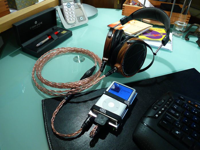 What can the RxMkII drive? Anything. That's not a typo or ill-considered hype. Using Ken Ball's 3.5-to-6.3mm wired adaptor, the toughest loads I could throw at his small amp were Fang Bian's HiFiMan HE-6 and HE-5LE orthodynamics. Nobody should/would walk the streets with them or any other expensive full-size headphone on a silly 3-meter leash. At home meanwhile, if such an amp could replace a regular wall-powered component, why not? Multi-tasking small gear is very attractive to iPodders who are so used to moving their Apple devices from dock to dock, pocket to belt to car and back.