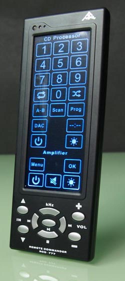 The input and volume up/down commands at the bottom and five special touch-screen icons above them are reserved for the AM-777 integrated amplifier which can be controlled from the same back-lit wand. |