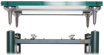 Fanciers of oversized turntables get the optional glass*1 shelf on top. That leaves 14cm of clearance for the tier below. Its very tall spikes park in receiver dimples of the exoskeleton. For equipment that somehow doesn't lend itself to Javier's preferred shelf-less scheme there are 12mm 52.5 x 42mm shelves that slip atop the decouplers. |