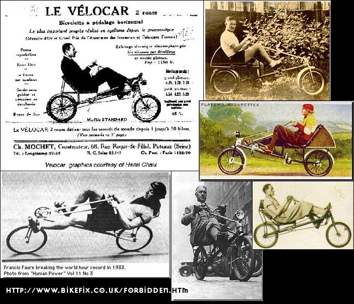 Non-audiophile-approved chronological gibberish: Skip this part... Bents have been around since the late 1800s (historical photos herein courtesy of Bikefix). The real story starts -- and stops abruptly just eight months later -- in July of 1933 when a second-rate racer named Francois Faure sets a new world record for distance traveled in an hour. On a recumbent, he does 45.056 kilometers, thus travelling at just a hair shy of 28 mph!. That annoyed a few folks like the United Cyclists Internationale (UCI). Shortly thereafter -- and to be generous with the verb here -- the UCI created some new rules to indicate that a recumbent wasn't a bicycle at all but rather something completely different and unrelated. Let's see now - two wheels, peddles, a chain, handlebars, a seat and human propulsion... clearly no relations whatsoever. The ruling took effect on April 1, 1934. Fast-forward to 1979. After Gardner Martin produced the first Easy Racer® recumbent, the Dupont chemical company offered $15,000 to the first human-powered single-rider machine that could exceed 65 miles per hour. And there you have it: The revival of the recumbent was upon us. Because they are 25 to 33% more aerodynamically efficient than a conventional upright bicycle, recumbents once again won the race. Their unique design also taught people that long-distance cycling needn't be painful. In fact, my bent is quite comfortable and offers a much better view of the passing scenery. But wait, there's more - you also get torso toning and strengthening that's not possible on a wedgie. And that means I no longer have to abdicate hope of ever having a flat stomach. Ease of experience. Alacrity. Tonal correctness. Works for me. |