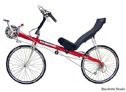 | a bit more disturbing -- that if you want to ride, you'd better hit the road for a few months. First, the inevitable dirt-turning-to-flour syndrome makes peddling through much of the course a lot more work than fun. Second, the rattle snakes peek their heads out from rock crevices, with many at impressive eye-level on some of the ravines we frequent. Experience is that marvelous thing which enables you to recognize a mistake when you make it again. [Franklin P. Jones] The idea of quitting the road race was not one I wanted to entertain. But really, it appeared to be time to give it up. The neck ache was interfering with my sleep, my riding buddies were pretending to feel no pain and I was tired of making ever-more-frequent co-payments to see the quak-chipractor for therapy. I told him as much during my last visit. He told me to "get bent." If you're going through hell, keep going. [Winston Churchill] So I did - get bent. Recumbent that is. No, the good doctor suggested, I shouldn't just lay down and give up. I'd spent years training and might rather try something out of the ordinary. So I got a bike that I could lay back upon. In fact, I got one from Bacchetta (stick in Italian), a company formed in 2001 by a couple of BVs - bent vets. With over 30 years of combined experience in the design and manufacturing of some of the world's most famous recumbents, this company, just two years later, won the recumbent-of-the-year award. The Strada I picked out (street in Italian) is a straight-forward design that fits in well with the wedgie crowd but offers all the comfort and aerodynamic advantages of a recumbent. It's also a serious open-road, high-rolling Tarmac-devouring machine - Shimano 105/Ultegra, with 26" rims on each end, seat height of 24" and a bottom bracket that's centered 32" off the ground. In short, it's a stick to beat the street with and some riders I could never keep up with before. The Strada is lean and nimble, handles the high-frequency climbs without taxing me into oxygen debt and cruises like a dream once you get the hang of it. |