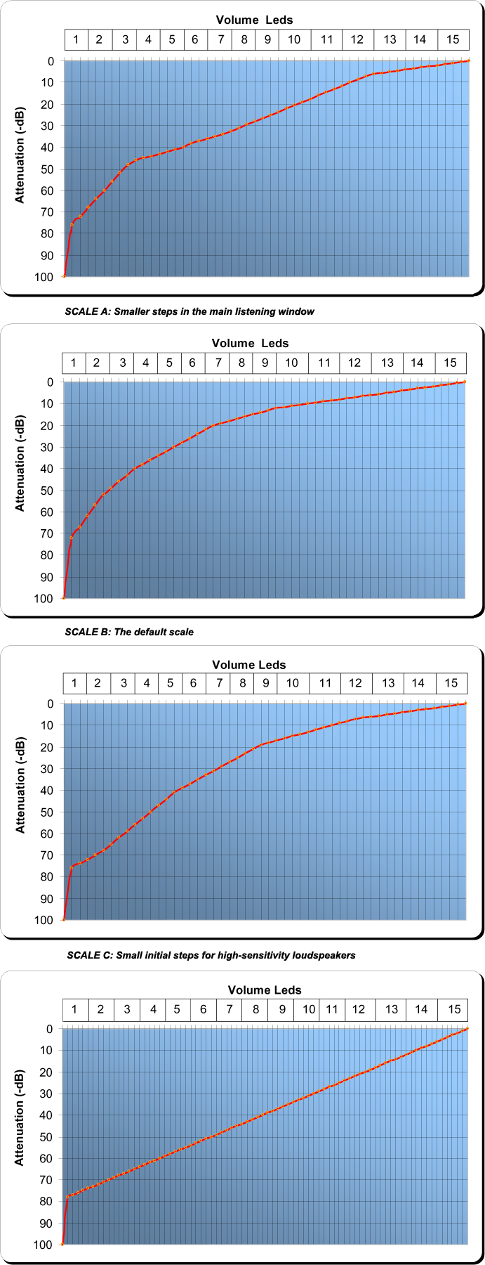 For the volume taper, the LEDs of the first four inputs correspond to scales A through D as shown below. The Crescendo integrated has six line-level inputs of which the last can be converted as a home-theater throughput. That effectively creates a stereo amplifier with a fixed output. The first two programming options store in non-volatile memory through power-down. The bypass smartly asks for confirmation with each cycle to not surprise a different operator. |