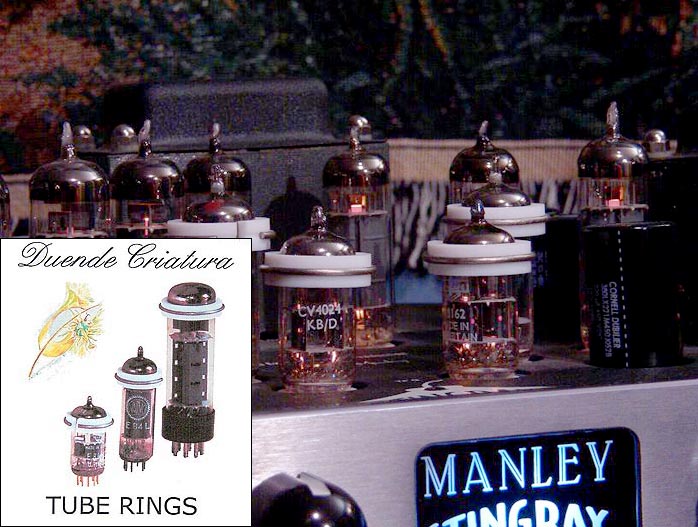 Courtesy of Divergent's Tash Goka, I've been experimenting over the last few months with these nifty little tube dampers from Holland called Duende Criatura. We all know that vacuum tubes are vulnerable to air and structure-borne vibrations which can have negative effects on music playback. Duende Criatura's Tube Rings are simple Teflon rings that are slit to expand slightly while slipping over a tube. There's a groove around the outer portion which contains a Titanium retainer clamp to ensure a tensioned fit. Lightweight and flexible, the manufacturer (who makes jewelry in his non-audiophile life) claims that Titanium will not induce eddy currents into sensitive tube circuitry. You simply slide these dampers over the tube and seat them at the top portion roughly where the getter resides. The Teflon can withstand temperatures up to 260 degrees and will not melt or stick to the tubes (hey, it's Teflon!). Nor will it accumulate any dust or alter color. Providing you position the ring correctly, it will not affect the tube's ability to dissipate heat nor alter its operating temperature. According to the manufacturer, the Tube Ring's vibration control properties will actually extend tube life. Just sliding the rings on the input and phase splitter tubes of my Stingray created immediate benefits. The soundstage was slightly wider and deeper and gained sharper focus and greater separation between performers. It was easier to pick out subtle details in the music to offering a more involving listening experience. These effects were immediately audible even during A/B/A comparisons. The result was magnified yet again when I slipped these thermionic prophylactics on the Manray's EL84s, with the added bonus of deeper, more powerful bass and a greater sense of dynamic agility. After several days of experimentation, I placed my condomized amp on the Gingko Cloud 11 platform. Yikes. What happened? All of a sudden, music became sluggish and closed in. Synergy was definitely not happening here. I suspect this was simply a case of too much of a good thing. However, synergy was restored when I removed the Teflon rings from the power tubes and kept the Stingray perched atop the Cloud 11. I obtained optimal results in this setup and have left it his way to date. All the sonic traits I mentioned earlier were now more explicit. The Tube Rings are nifty little guys and worthy of investigation by anyone who owns tube gear. Try 'em out on your signal tubes first, then perhaps even your power bottles. The Tube Rings are available in eight sizes and cost starts at roughly $17 per ring. [I too have experimented with these tube dampers on my Audiopax Model 88s and noticed the same effects - a slight step-up in resolution and clarity. My initial results on the KT88s were negative as though I'd induced overdamping. The music lost some sparkle and flow and felt constricted. However, subsequent changes elsewhere in the system now allow me to use the dampers also on the power tubes with good results but my gut instinct is that unlike the seemingly universal recommendability on small-signal tubes, output power tubes require one-on-one experimentation. - Ed.] |