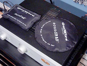 | Last year I had obtained positive results with GutWire's NotePad resonance control product and thought it to be worthwhile to add to one's arsenal of tweaks to combat the negative effects of resonance. These dense pillows can be placed on or under components. I preferred them resting on top. When GutWire discovered many customers were using two NotePads on each component, a larger pad was developed. Like the NotePad, the new SoundPad contains a thick viscous fluid in a black nylon bag. However, the SoundPad contains nearly twice the amount of goo and has an attractive circular shape. As useful as the Note | |||||||||||||