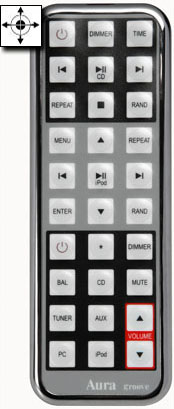The Groove contains Apple recognition software to transfer file meta data from an iPod to its own display. Then the Groove's nine iPod-specific controls on the remote (menu, enter, repeat, random, up/down, left/right and play/pause) also do the finger walking. This simultaneously defeats all the iPod's own controls including volume. The iPod's display simply shows the orange sun with the super-imposed Apple logo for signal lock, below it artist and track name in an endless exchange. The Groove's display meanwhile turns into a ticker tape which displays the iPod's usual data. All the iPod's functionality is retained from the Aura remote and only scrolling one item at a time—the Groove's display is limited to one line—through lengthy lists is rather less convenient than the iPod's snazzy scroll wheel.