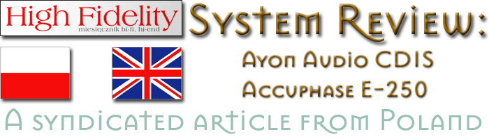 This review first appeared in the March 2009 issue of hi-end hifi magazine High Fidelity of Poland. You can also read this review of the Ayon CD1s/Accuphase E-450 in its original Polish version. We publish its English translation in a mutual syndication arrangement with publisher Wojciech Pacula. As is customary for our own reviews, the writer's signature at review's end shows an e-mail address should you have questions or wish to send feedback. All images contained in this review are the property of High Fidelity. - Ed. Reviewer: Wojciech Pacula Review system: Go here Review component retails: 10,900zl for the Ayon, 16,900zl for the Accuphase [1zl is ca. €0.2] |