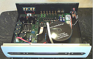 A look at the innards revealed the pre- and power amplifier section boards and the massive 538VA potted toroid. |