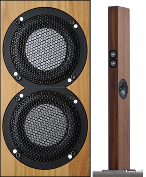 The SLS—schlanker Lautsprecher or slim loudspeaker—pioneered the flat Tangband honeycomb wideband tweeters for Sven's portfolio. It next was applied in similar parallelism to the B8 and B10 first shown at the Highend Suisse 2010. The B8 uses three 3-inchers, the B10 two 4-inchers [F Series W4-1757SB above]. Both models follow the SLS precedent of ultra narrow baffles with sidefiring woofers.