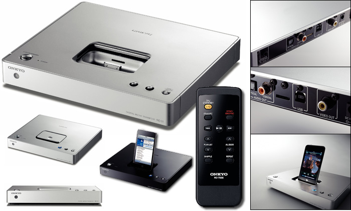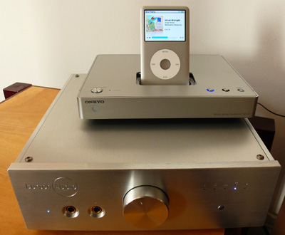 HiPod headfi detour. The below setup should get headfiers' attention. For €200 retail and delivered by post, Onkyo's ND-S1 dock is cheaper than Wadia's 170i but likewise extracts the raw digits from an iPod via Apple's authentication chip over Toslink or coax with a ±10ppm circuit clock. Basic features include auto switching to the iPod upon insertion, iPod recharging and a small remote (not that the latter should see much if any use in a standard bedside or similar headphone context though it does work splendidly from 5 meters away). The power supply is a universal 5V/1A wall wart, dimensions are a petite 205 x 24 x 175mm WxHxD and weight is 530g. Trim is black or silver and a USB port can pass digital files from a hard drive through the digital outputs or sync up the iPod to an iTunes library. In streaming terms, this Onkyo + iPod combo makes for a complete digital transport. It's small and cheap but very effective.