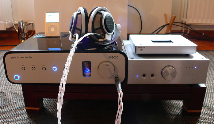 For headfi, the smart money wants to know how the $999 Peachtree Audio iDecco held up to the $1.500 Onkyo/Burson combo ($123 Black Cat Veloce digital cable included). The Burson's winning streak continued. Whether due to higher gain, beefier power supplies, discrete current-to-voltage stage or actual converter implementation, it again had the more robust intense presentation with deeper blacks. The iDecco was more laid back energetically and in staging perspective and injected more white into the color palette. Even accounting for taste, I believe that a good cross section of listeners would have unanimously crowned the Onkyo/Burson duo victorious while admitting that this came at the cost of 50% more money. For an all-in-one solution that drives monitor speakers to boot, the iDecco still rules. If your needs don't include loudspeakers however, the Burson with an Onkyo or Wadia-style iPod dock become an unambiguous and very noticeable step up over headphones.
