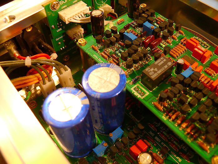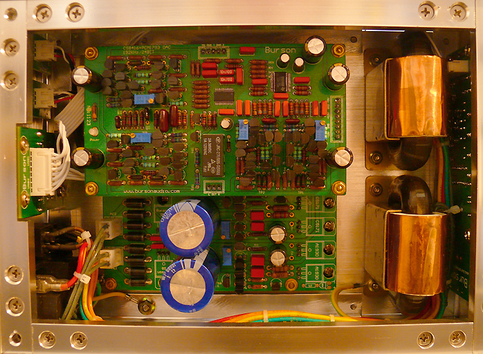By din of its compact dimensions, Burson's signature all'round 6mm aluminum vault construction seems even chunkier for the DA-160 than usual. Four output transistors bolt directly to the bottom panel (along the right edge of the exposed half of the lower board). Quality details abound. Where the far costlier Zodiac Gold runs plastic snap-on stand-offs, Burson uses metal posts with quality bolts. The inward cheeks of the power transformers run beefy metal covers to shield the circuitry from radiation. Circuitry is executed in dual mono for maximum noise separation and the signal path over PCB traces is less than 6cm long. Parts include Elna Audio caps and Dale military-grade resistors. Overall build quality is very high and frankly extraordinary in this price range.