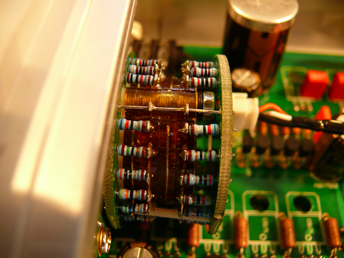 The 2 x four holes in the foreground of the circuit board below look at the output power transistors beneath it.