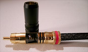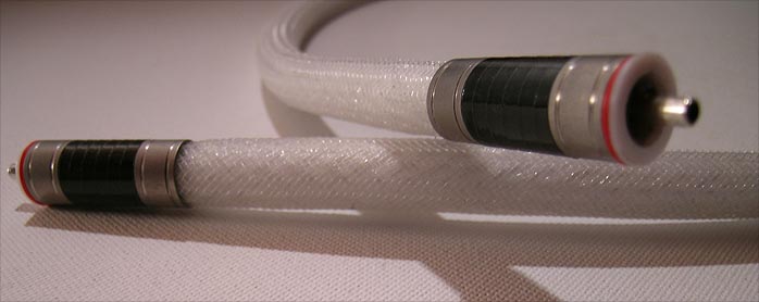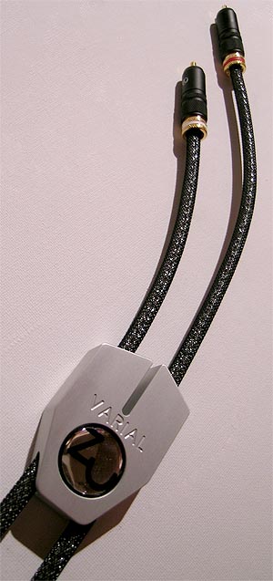 | Varial which became a complex and longwinded process due to the sheer number of variables involved. The dielectric in the Varial is tetra-fluorinate, a Teflon-type material doped with titanium dioxide. There's secondary screening to shunt RF to ground via an aluminum alloy. Termination is completely solderless since we don't believe that the introduction of contact resistance is a good thing. We cold-forge the conductor with a high-pressure crimp to the pin and plug tulip. This connection is then hermetically sealed with a special putting compound. The outer jacket is black polyester for appearance and the machined billet-aluminum V-block keeps pairs matched and indicates directionality, with the point of the V aimed at the load. As far as electrical parameters go, here they are: Varial 1.0m (3.3') terminated with phono (RCA-type) connectors - DCr (center pin) 0.013 Ohms; DCr (pin's mate) 0.013 Ohms; Cp (pin / ground) = 286 pF (open); Ls (center pin) 1.2 uH (open); Ls (pin's mate) 1.2 uH (open); DCr (shield) shunted to earth at load only; R/T -t (1kHz - 100 MHz) +/- 2 nsec (min delay 2 nsec, maximum delay 6 nsec); bandwidth +/- 1.dB > DC - 100MHz; linear phase." |
