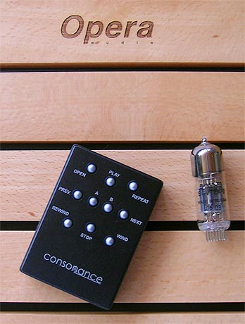 One Sovtek 6H30 super tube made famous by BAT is mounted horizontally to buffer the output. It kicks into "full-on thermionic emissions" after about 40 seconds and is claimed to be sonically stable after as little as 5 minutes, with 30 minutes the maximum allowable time for audiophile neurosis. The clean fascia recalls Accustic Arts of Germany but Opera's two chromed knobs aren't push/turn but funky tilt affairs, with the left one controlling power/open, the right one play/stop/last/next by canting the knob up, down, left or right. Unfortunately, the included metal remote with its 36kHz Philips code absconds not just with user-selectable Fir filters and dither -- expected for this concept -- but also direct track access. If you want that feature, swap the stock remote for the full-function clicker that comes with the Droplet. |