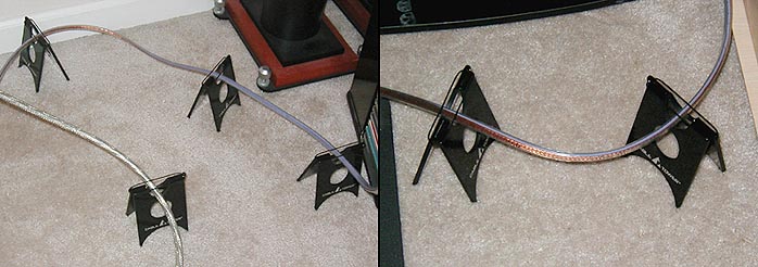 | For four years, my loudspeaker cables have been resting peacefully on the carpeted floor of my listening room, blissfully happy while accepting a steady flow of current through their copper, silver and gold-plated conductors. Then, all of a sudden, audiophile missionaries decided to colonize my listening room. They righteously demanded that I dress these savage cables and prohibit them from ever lying down in parallel again! According to the sermons of the missionaries, if the cables must cross paths, each must be perpendicular to the other to prevent RFI and crosstalk. Rearranging my cables resulted in audible improvement so I went along with the fervent faithful. After visiting the Dedicated Audio room at CES this year, I requested a review sample of the Cable Towers to hear for myself the added benefits of suspending cables above a carpeted floor. According Daniel Harmon from Dedicated Audio, the static electricity produced by my builder's grade wall-to-wall carpet can have audible effects on speaker and power cables left lying around whose electromagnetic field around the conductors won't develop properly surrounded by static charges. The Cable Towers are designed to turn your power and speaker cables into an elevated electrical highway. |