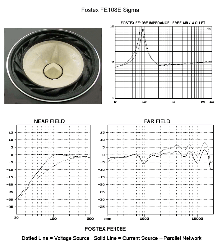 Comments: We borrowed this from Ed at the Horn Shoppe and as far as I can tell, he has the world's supply by virtue of buying up all he can get. This is one of the smaller units of the latest editions of the Fostex banana fiber cones. An obvious comparison would be to the similarly sized Lowther DX55. The DX55 has much higher efficiency and a more detailed top, the Fostex counters with slightly better bass extension. Madisound sells them for $85/each. At that price, it's easy to check it out for yourself. I gather that it really prefers a rear-loaded horn, not a sealed box, but you can use it either way with good results. Note: I did not get a picture of the FE108E Sigma but it looks just like the FE208E Sigma so I simply shrank a picture of that.
