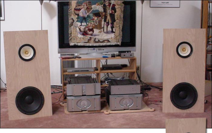 | "The F5 uses what I would refer to as low impedance voltage feedback - as pointed out earlier, the circuit is a CFP complementary feedback pair variant. Maybe it should be called a complementary-complementary feedback pair with voltage gain. CCFPWVG is a snappy acronym, no? The point is, this is routinely referred to as 'current feedback' in the op amp literature but it has been misnamed in this regard." Taking pity on prospective and already committed F5 rollers for lacking any type of audition feedback when none had finalized their own DIY variants yet to post sonic impressions for the fence sitters, Nelson Pass then did something quite out of character. He commented on the sound of his own amplifier, something he usually leaves to others: "The F4 is the closest relative. They both have a clean extended bottom and I consider them almost equivalent, with neither having a distinct advantage. The F4 is a little bit warmer in the mid and might be preferred on simple material at modest volume levels, that is to say a solo vocal or instrument or maybe a string quartet. You could say it's a little more tubey. [Above, biamping with an F3 driving the Feastrex units, X150s on 15" woofers.] |