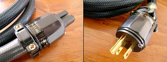 | Before you protesteth too much -- with a Shakespearian "not another bloody cable company, Horatio" perhaps --consider pricing. Furutech's premier Reference line [above] tops out at $990 for a 3' pair of single-ended interconnects. Balanced adds a mere $130. That's their very best and most expensive. Clearly, this company loathes silly shekel shenanigans. Then there's 3M's GC-303 compound. Its claimed effects recall Stillpoint's Carbon-based ERS cloth. Think passive EMI/RFI absorber. The GC-303 variant finds itself applied as chassis lining inside all of Furutech's passive power bars. It also appears on its Reference cables and cords. There it is stealthily tucked into cylinders which cuff the wires closer to one end than the other. Unlike competitors whose shiny barrels routinely add nothing but weight and gussied-up spin factor, Furutech's barrels actually do something. Pertinent to performance that is. Like Mark Hampton's ZCable Z-Sleeves, they act as "zero gauss" tunnels. The passing signal is stripped of whatever EMI/RFI components might have been picked up in a preceding components or in transit on the cable itself. The new Furutech Evolution line of cables duplicates the Reference III metallurgy. Where it differs is that it eliminates the hexagonal GC-303 barrels, uses different Furutech connectors and essentially costs half [$495 Evolution power cord below]. |