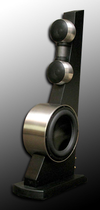 Let's quickly recap Gallo's technical solutions beyond the obviously challenging geometry of spheres, vertical cylinders and horizontal canisters cradling seamlessly in an angled metal spine for an assembler's nightmare. They are the paralleled custom 4-inch Carbon-fiber midranges; the filter-free proprietary hi-tech tweeter with 180° dispersion and massive surface area; a simple 1st-order series filter on the sealed sidefiring 10-inch woofer and midranges; a 2nd voice-coil woofer-direct input to extend response; an OPT® input; and decidedly full-range and high-output performance from a physically quite diminutive (35" short) loudspeaker.