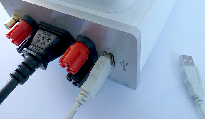 This image opens to 2000 x 1500 at 301KB The choice of 1/4" headphone socket is clearly aimed at more serious listeners as are the quality connectors and IEC power inlet. Yet the USB connection spells computer audio as well. |