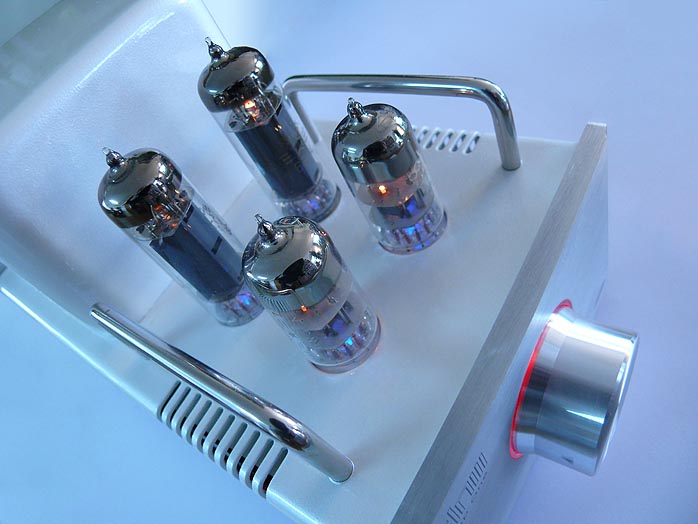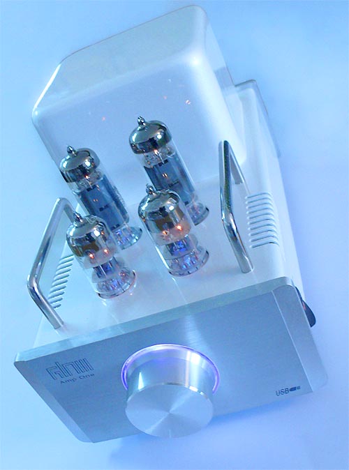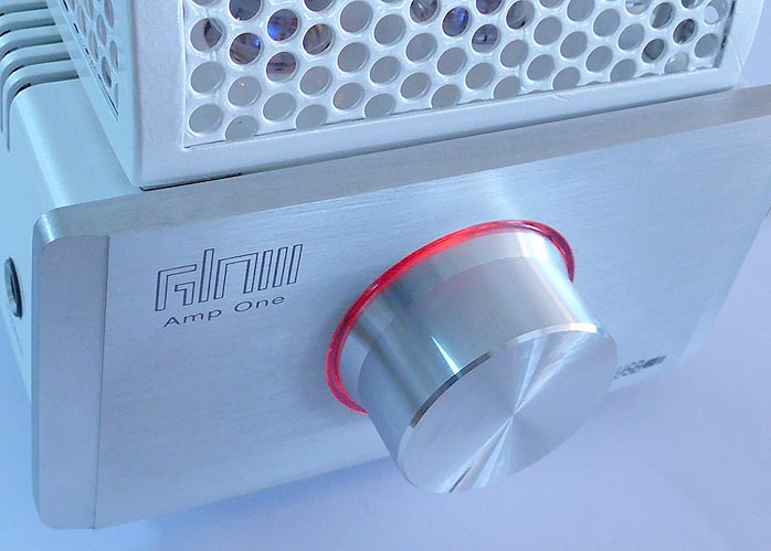 The first Glow offering is a single-ended pentode integrated with USB input, one RCA input, one 1/4" headphone output on the left check and 6 different color options in thick high-gloss Enamel over anti corrosion sub-coated steel. The attenuator is a quality Alps, tube sockets are ceramic, the innards are wired point to point, the transformers are precision hand-wound jobs, negative feedback is minimal, bias is automatic and internal voltages are switchable from 115 to 220V with a chunky slider on the belly. Having seen an earlier Antique Sound Labs headphone amplifier of equally demure size, I can tell you unequivocally that the Glow beats it pants off in build quality and heft. Sure it's no Boulder but for 488 quid, you'd need a boulder for a frosty noggin to expect it. Besides the obvious amenities, there's the backlit power button on the right cheek; the constantly color-changing light ring around the attenuator; and the absence of an input selector which you won't need. |