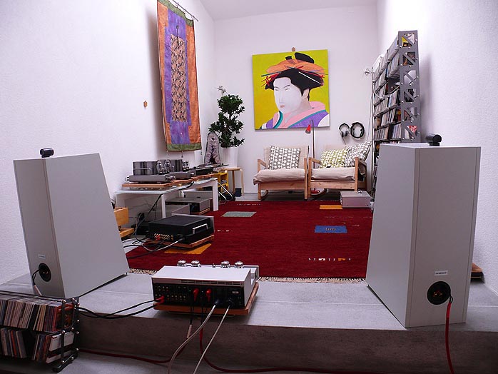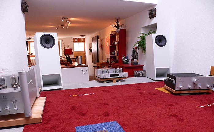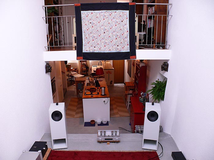 The Alpha runs dual 18s in a front-loaded bass horn configuration with a coaxial compression driver for a 3-way 103dB concept. The Beta [left] works a single 15-incher mated to a mid/treble compression driver for a 96dB 2-way system. Both models are time-aligned. The Alpha horn requires a 35m² + space to spread its wings and actually sees 60m² in Austrian distributor Reno Barth's digs [photo below]. The Beta likes from 25m² on up. Space huggers unkeen on space hoggers now have the Rho. That's the smallest member of team Haigner to date though the forthcoming single-horn Gamma (to be used with various external 15" subwoofers) will be smaller yet. The Rho is a 2-way multi-chamber rear-hornloaded speaker around an 8" mid/woofer augmented by a small bullet tweeter. With dimensions of 28 x 81 x 51cm WxHxD and a readily manageable weight of 30 kg each, it's not the 90dB voltage sensitivity that's special on paper but the impedance curve: 7 ohms +/- 1 ohm from 100 to 20,000Hz. Low-power lovers of the SET variety (triode or transistor) recognize this as a virtue. |