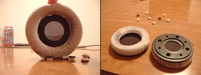 Many have complained about comfort issues with Grados, which could be attributed to the supra-aural nature. The bowl pads that come with current Grados also suffer a treble shrillness that I find unacceptable. I much prefer the original flat pads sold by Todd the Vinyl Junkie. Larry's created new ear pads for the Grados, taking the circumaural velour pads of the Beyer DT770s to fit them right on the Grados by placing a wooden board adaptor within the velour pad itself. You snap them right on and Shazaam, circumaural Grados. The wooden board adaptor of the pads includes several ports, which can be plugged with wooden pegs to control the amount of airflow for more or less bass presence. With the C-Pads, the fit is more comfortable. The velour is plush and fits around the ear, creating a nice, soft and relaxed feeling on the ears with minimal pressure and clamping force. Compared to flat pads, the C-Pads have a more spacious soundstage and a better sense of inner detail especially on string instruments. Compared to bowl pads, the high end is nowhere near as shrill and the bass is more full-bodied. Physically, the drivers' distance from the ears is about halfway between flats and bowls, creating a nice balance. Those who feel that flat pads are congested, too dark and lack inner detail will appreciate the C-Pads. Those who feel bowl pads are too shrill with little bass will find the C-Pads a great improvement. Add the ability to tweak the bass performance with the ports and you get a highly customizable setup. Simply plug holes, trap more air and create a fuller bass presence. Or go the other way. Whatever floats your boat. |